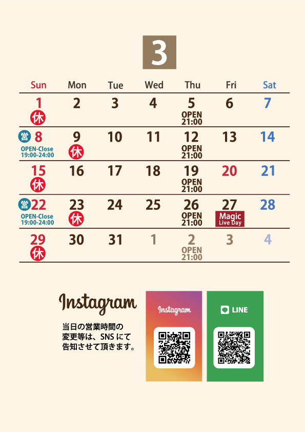 Top Live Barの営業カレンダーです。